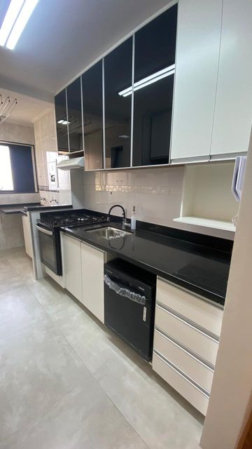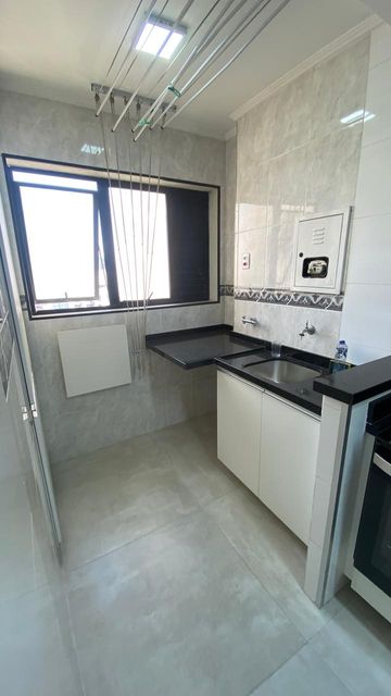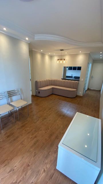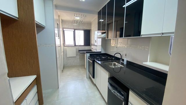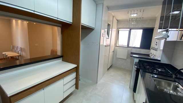 Sala com dois ambientes, com lindo canto alemão para mesa de jantar, sanca, iluminação decorativas com spots led´s, porta balcão para a varanda, fechada com vidros, cozinha com moveis planejados, com janela, armários planejados, pia de granito na cor preta, depurador com fogão embutido Electrolux novo e maquina de lavar louça nova, area de serviço com armários, 2 dormitórios sendo um deles com guarda roupas planejado e outro com closet, suíte com pia de pedra na cor mármore, com bom em vidro tipo camarão, bem iluminado, banheiro social com porcelanato pia em pedra na cor preta Box de vidro.