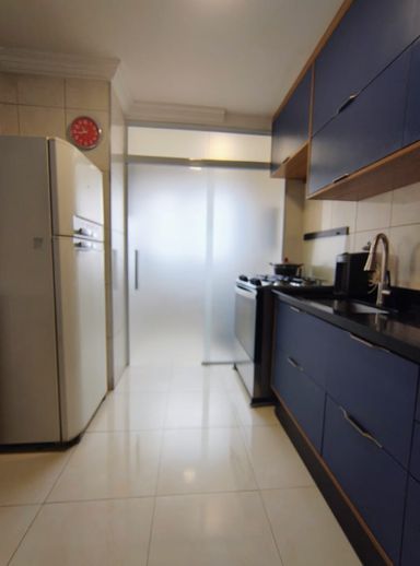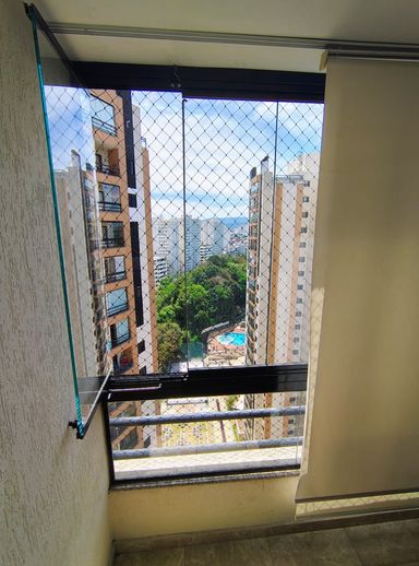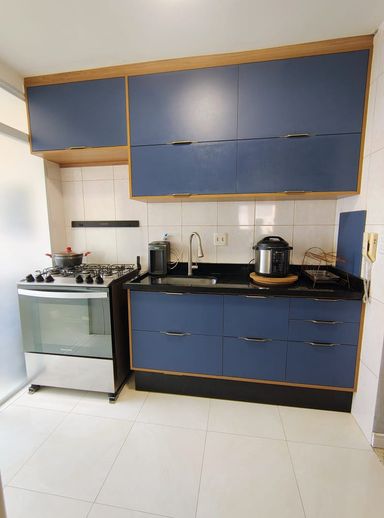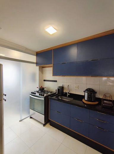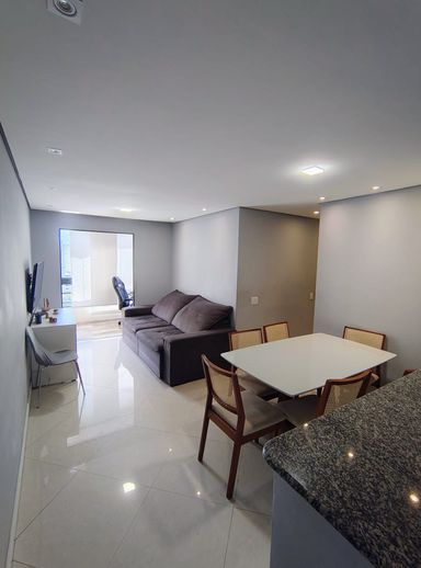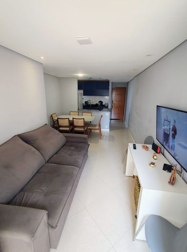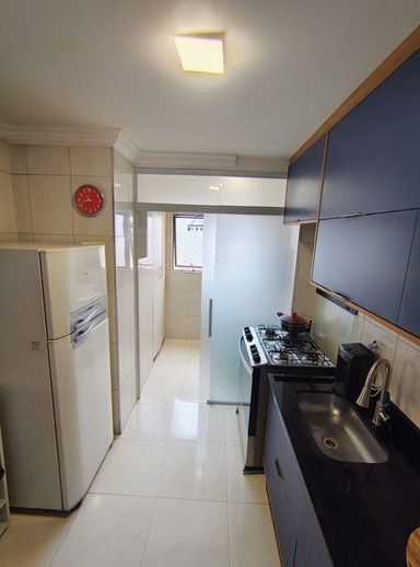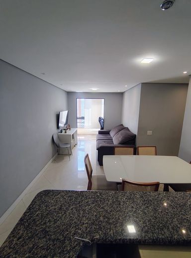 Sala com dois ambientes, teto rebaixado, iluminação decorativas com spots led´s e porta balcão para a varanda fechada com vidros, ampla, cozinha aberta para a sala criando um excelente e agradável ambiente com armários planejados, pia de granito na cor preta, lavanderia reservada, 2 dormitórios com guarda roupas, bem arejados, suite e banheiro social Box de vidro. Andar alto.